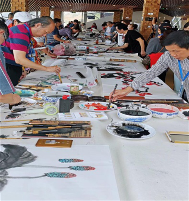 四川省詩書畫院、四川省美術(shù)家協(xié)會(huì)、四川省書法家協(xié)會(huì)等百余位書畫藝術(shù)家齊聚西嶺之巔,通過現(xiàn)場(chǎng)百人筆會(huì),傳書畫之神韻,承經(jīng)典之精髓,可謂盛況空前。
