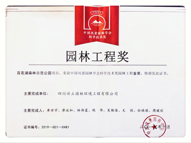 會(huì)上,由興立園林施工,傳承景觀深化設(shè)計(jì)的精品工程“貴州百花湖森林公園”榮獲“中國風(fēng)景園林學(xué)會(huì)科學(xué)技術(shù)獎(jiǎng)園林工程金獎(jiǎng)”,該獎(jiǎng)項(xiàng)曾于2016年暫停評選,2019年重新啟動(dòng),截至目前為止,興立園林是2019年度四川省獲此殊榮的唯一企業(yè)。